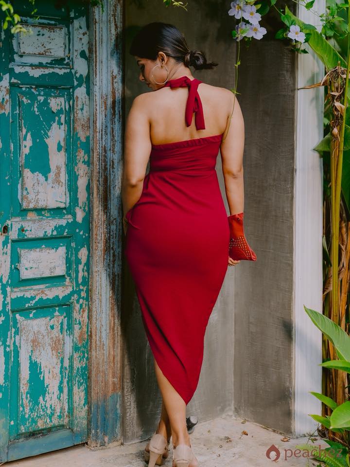 Solid ruched halter neck backless bodycon dress